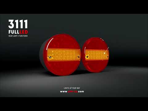 Fanale posteriore full LED, tre servizi rotondi con diametro di 14 centimetri, funzionamento a 12 o 24 volt, con servizi di luce di posizione, luce freno, lampeggiante variabile (standard o sequenziale), connettore tipo pressacavo. Il design e il colore del paralume ricordano la bandiera spagnola.