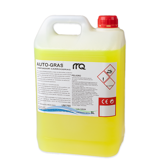 Auto-Gras es un efectivo limpiador desengrasante diseñado especialmente para carrocerías. Su fórmula se basa en disolventes de poli-alcoholes e inhibidores que protegen contra la corrosión, lo que lo hace ideal para eliminar grasa y suciedad persistente. Este producto contiene hidróxido de sodio (NaOH) y destaca por su potente capacidad de limpieza, logrando eliminar las impurezas más adheridas sin necesidad de esfuerzo físico significativo ni el uso de productos químicos agresivos.