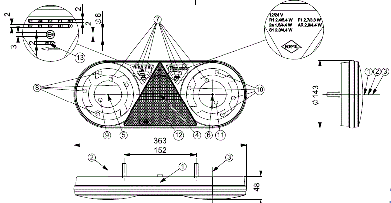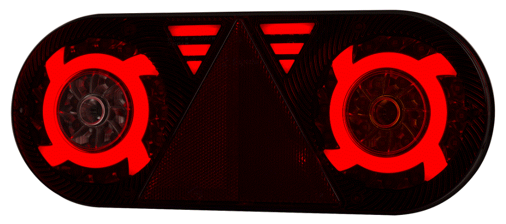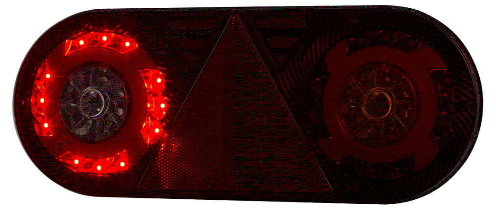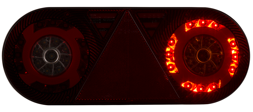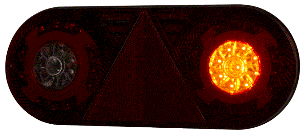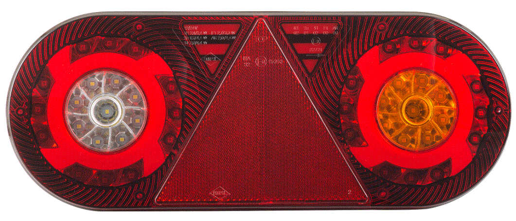 Fanale posteriore multifunzione (6 funzioni) a LED 12/24 V - Destro (lato passeggero). Luce di posizione con effetto neon, retromarcia, antinebbia, stop, indicatore di direzione e riflettore triangolare. Omologazione E9 - Dimensioni in mm. Lunghezza 363 Altezza 143 Larghezza 48 - Fissaggio tramite 2 viti M8 con interasse 152 mm. Grado di protezione IP: 68 - Temperatura di esercizio: tra -30 °C e +50 °C. Collegamento tramite cavo da 2 metri. Senza connettore specifico.