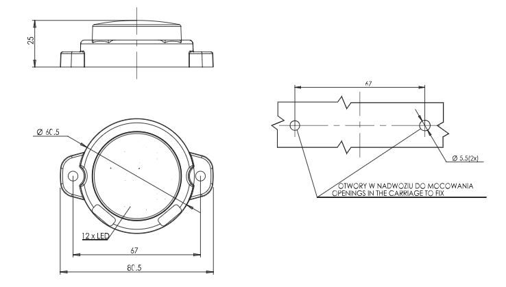 Luce rotonda a LED. Indicatore di direzione posteriore ambra. Funzionamento a 12 e 24V Lato di montaggio: destro e sinistro Alloggiamento in gomma Protezione IP6K9K Dimensioni: Diametro esterno: 60 mm - Distanza dei fori di montaggio: 67 mm Omologazione europea E20